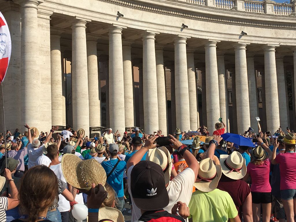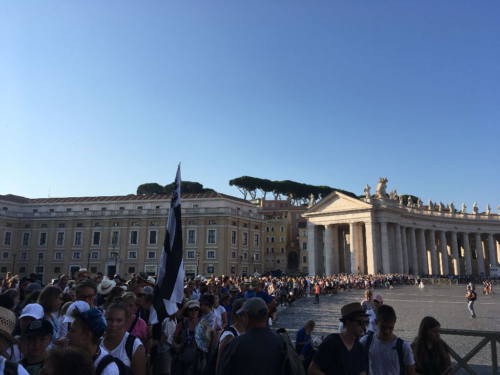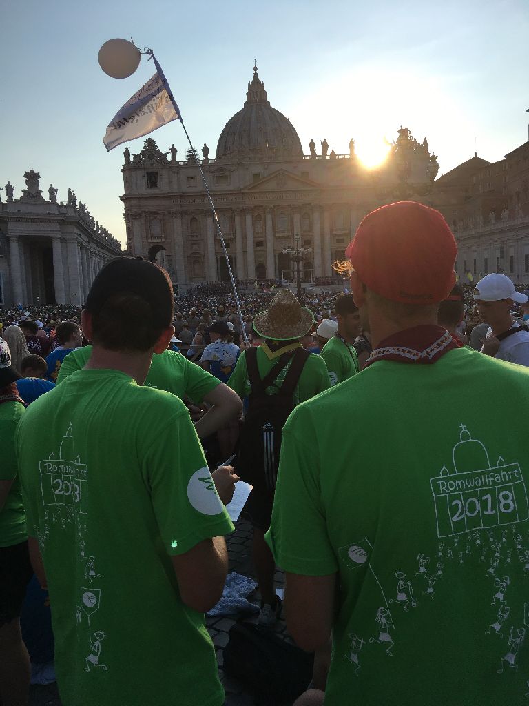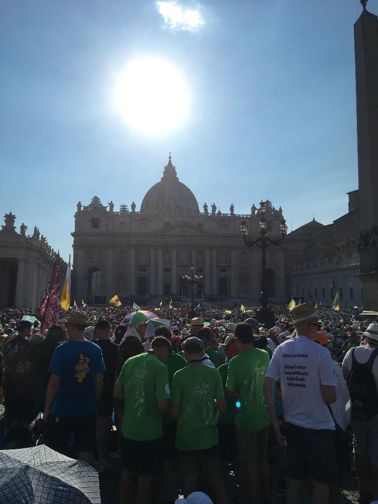 Heute war ein besonders anstrengender Tag, nachdem wir am Vormittag in Santa Maria Maggiore waren und wieder einiges von der Stadt sehen konnten, ging es nach der gemeinsam Hl. Messe auf den Petersplatz. Dort mussten wir sehr lange in der Hitze der Mittagssonne anstehen. Nach 3 Stunden waren wir endlich auf dem Platz und nahmen mit viel Freude an der Audienz mit Papst Franziskus teil. Ein Höhepunkt war natürlich auch, als er über den Petersplatz an uns vorbei fuhr."