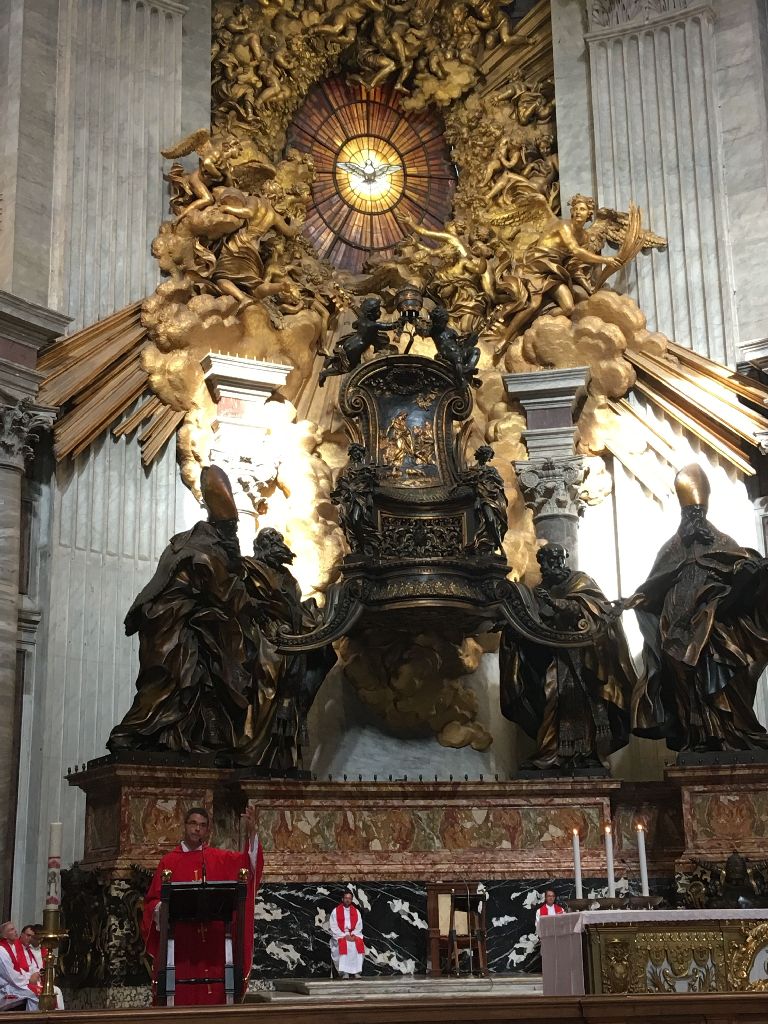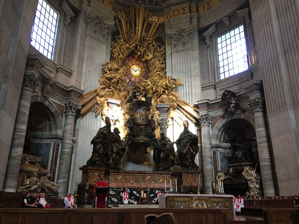 "Heute ging es für uns Ministranten aus dem Bistum Fulda früh los. Wir machten uns auf den Weg zum Petersdom, um dort die Hl. Messe gemeinsam zu feiern. Schon um halb acht war die Schlange zum Petersdom über den ganzen Petersplatz. Wir feierten die Hl. Messe mit Kaplan Florian Böth und erkundeten den Petersdom.