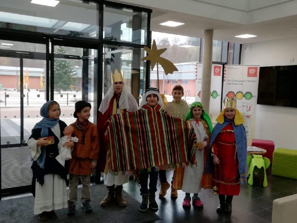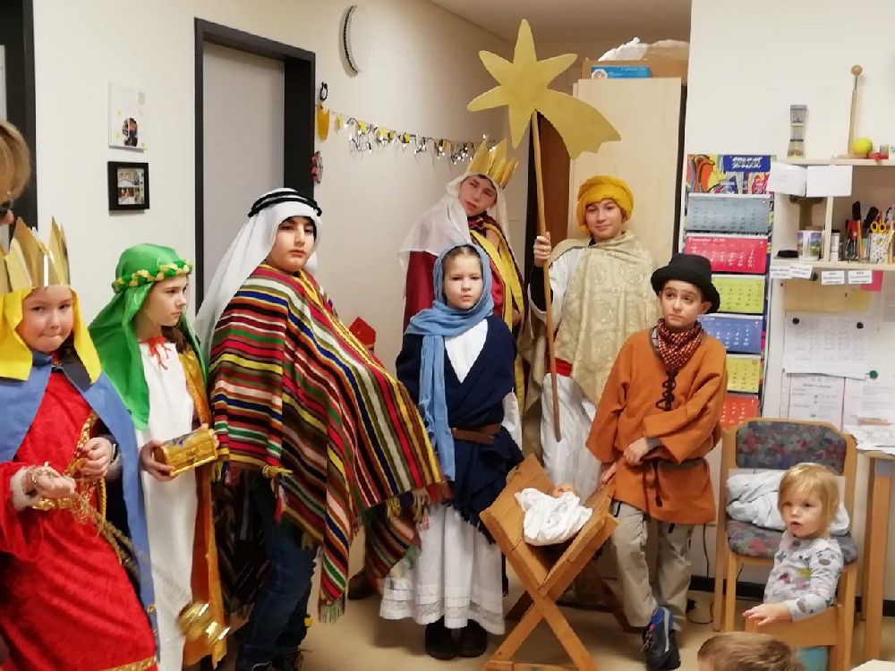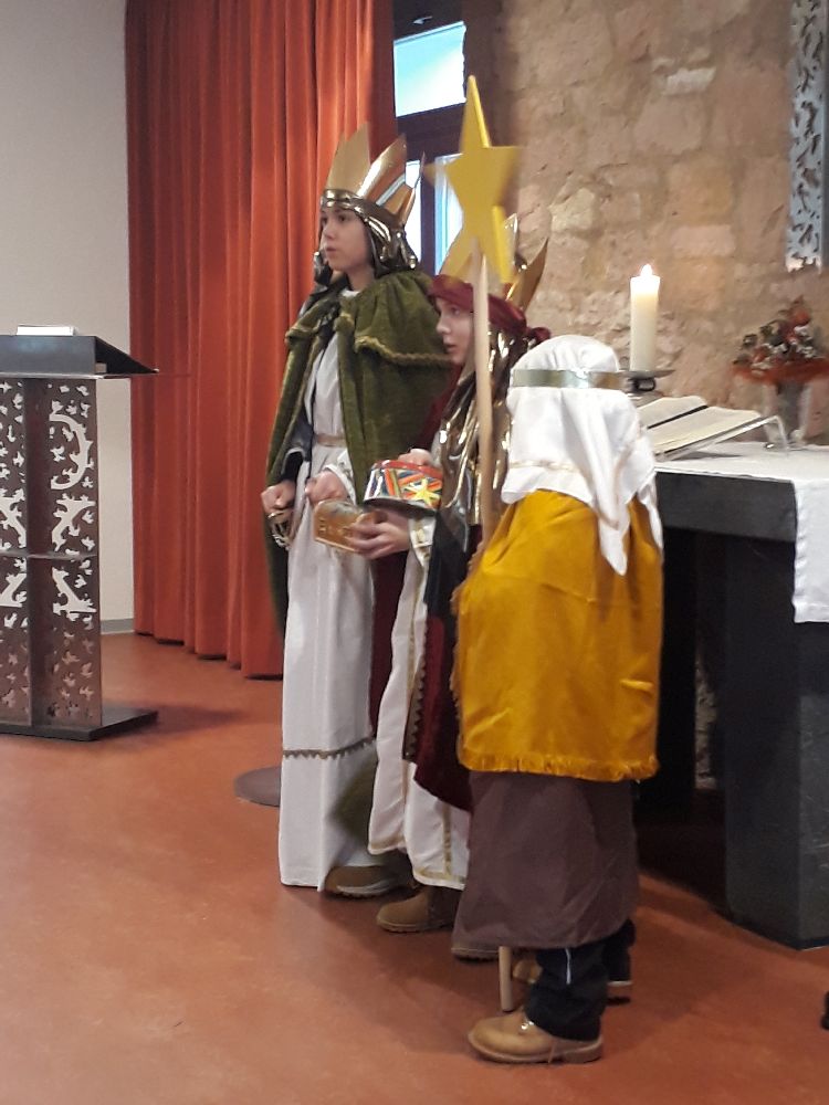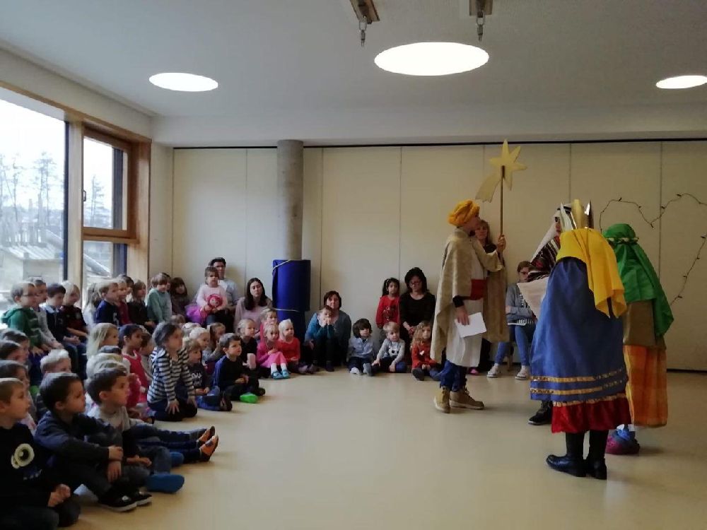 Im Kindergarten wurde die biblische Geschichte von den Hl. 3 Königen gespielt, dann berichteten die Sternsinger den Kindern von ihrern Aufgaben, und schließlich wurde der Segen an die Tür geschrieben. Die Krippenkindern wurden besucht und der Segen wurde ins Bürgermeisteramt gebracht. Zum Abschluss brachte eine Gruppe den Segen in die Emaus-Kirche.