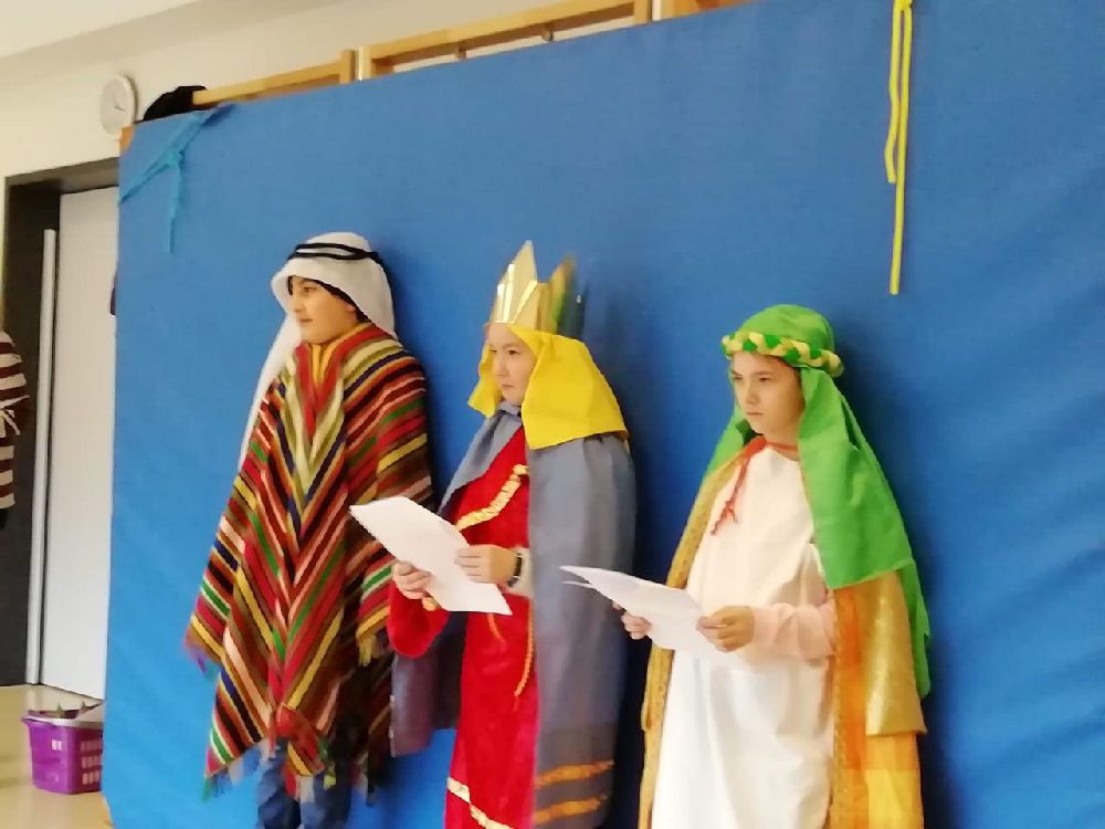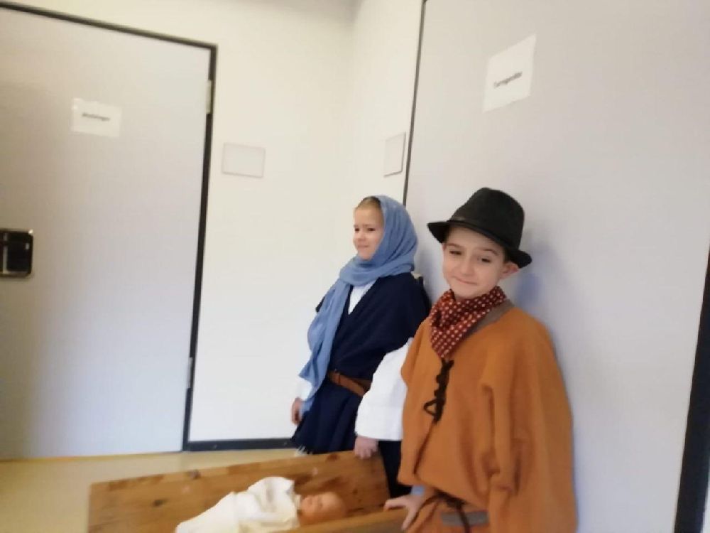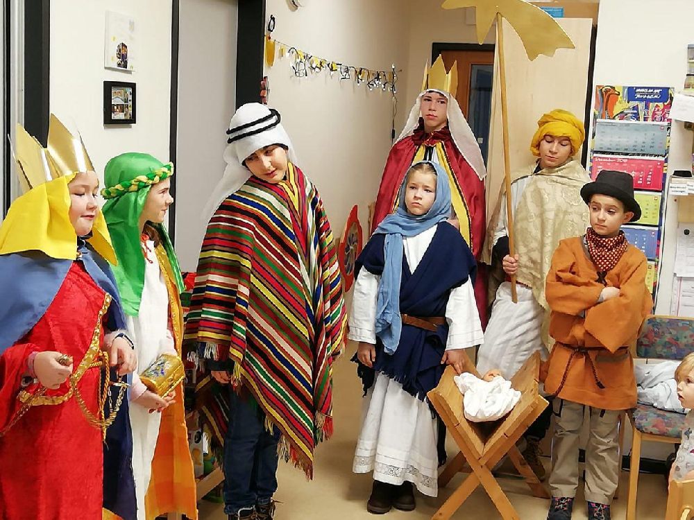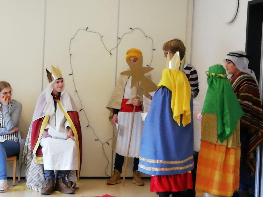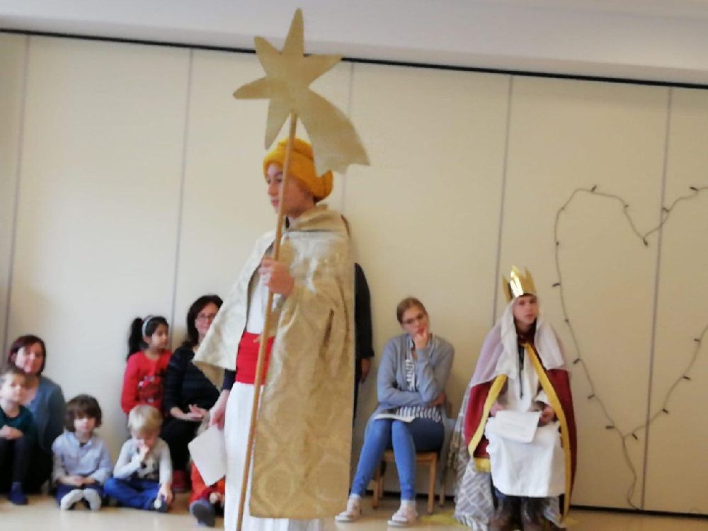 Im Kindergarten wurde die biblische Geschichte von den Hl. 3 Königen gespielt, dann berichteten die Sternsinger den Kindern von ihrern Aufgaben, und schließlich wurde der Segen an die Tür geschrieben. Die Krippenkindern wurden besucht und der Segen wurde ins Bürgermeisteramt gebracht. Zum Abschluss brachte eine Gruppe den Segen in die Emaus-Kirche.