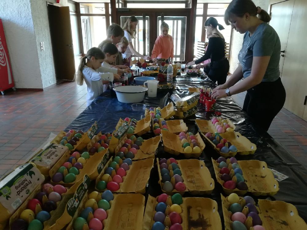 Am Gründonnerstag haben 17 Ostereierfärber mit Begeisterung 550 Ostereier gefärbt. Ein Teil der Eier wurden an die Bewohner des Seniorenheims verschreckt und der größte Teil zugunsten der BDKJ- Aktion "Oskar-hilft" verkauft. Die restlichen Eier sind für das Osterfrühstück nach der Auferstehungsfeier am Ostermorgen!