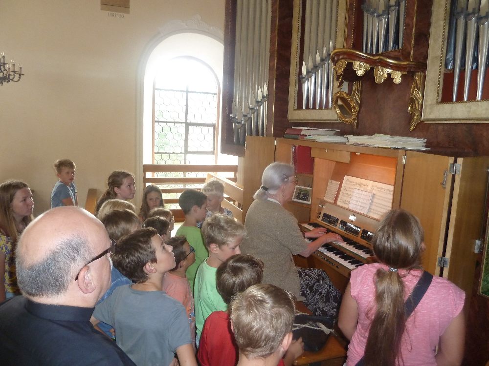 Das Angebot fand reges Interesse, 20 interessierte Kinder wollten auch mal die Bereiche sehen, die man als Kirchenbesucher nicht sehen kann. Unsere Organistin Ursula Grob spielte die Orgel und erklärte wie eine Orgel funktioniert, dabei gab es auch die Gelegenheit in das Instrument mit den 21 Register, den 1360 Pfeifen und der notwendigen Mechanik zu schauen. Pfarrer Karl-Peter Aul stellte die Sakristei mit den liturgischen Geräten und Gewändern vor. Unsere Gemeindereferentin Christina Walk führte durch den Innenraum der Kirche mit den Altären und Heiligenfiguren. Mit Richard Pfeifer konnte man den Dachstuhl unserer Kirche besichtigen und im Turm bis zu den vier Glocken steigen.