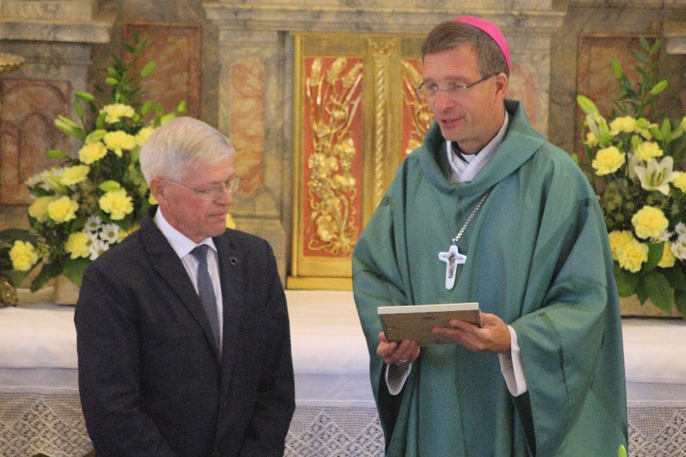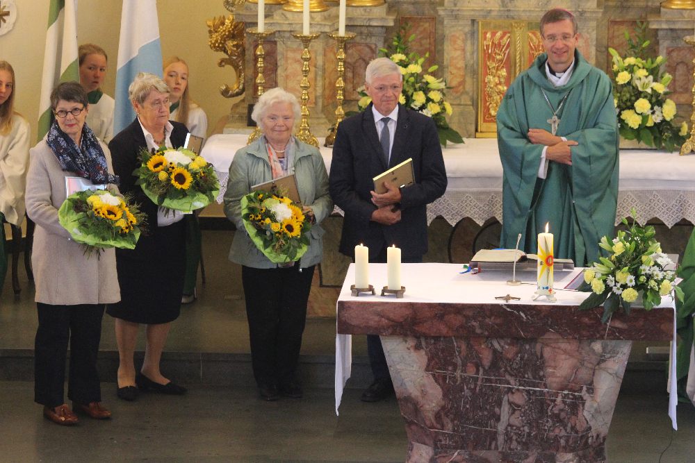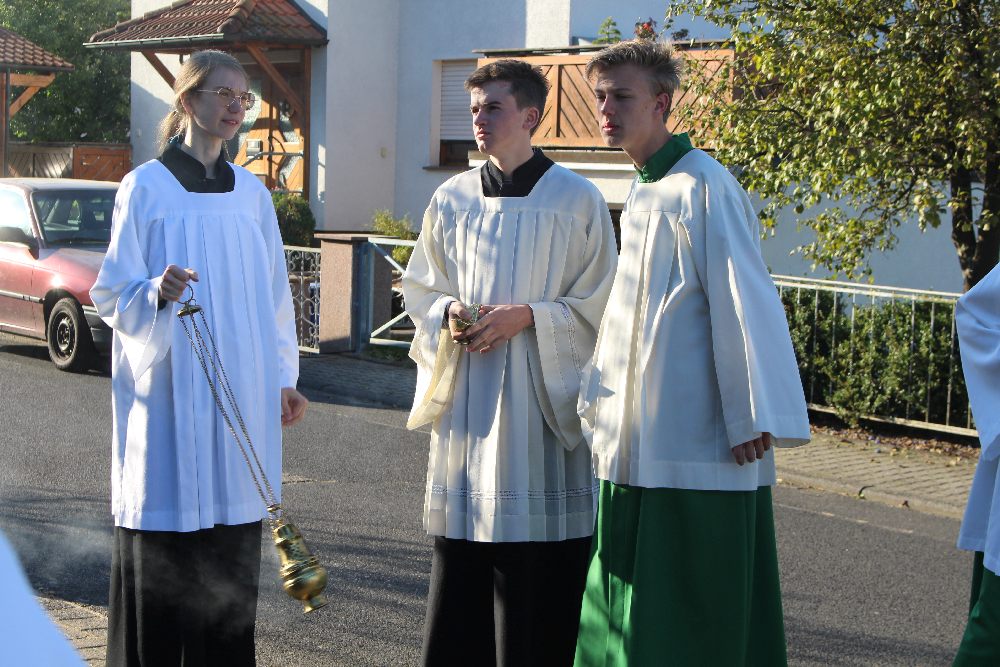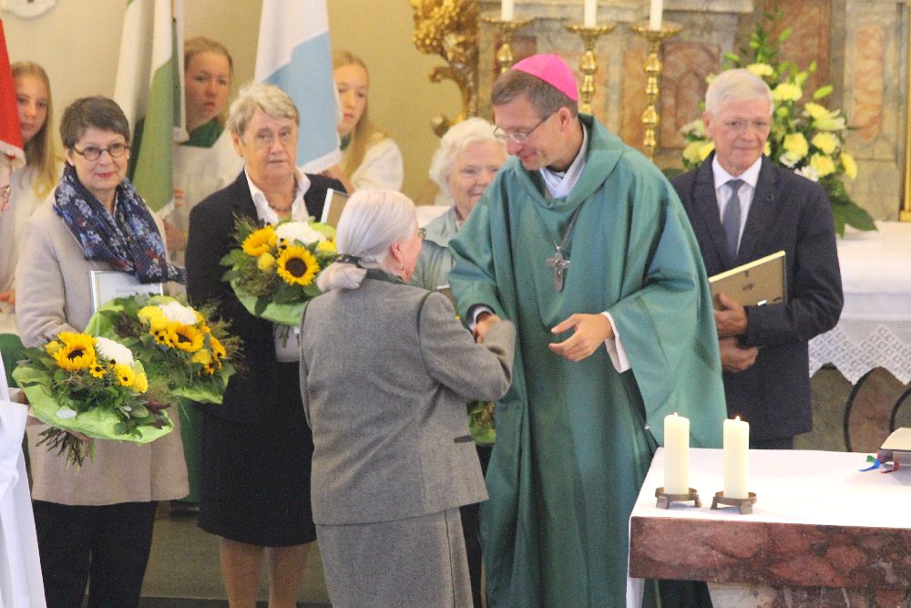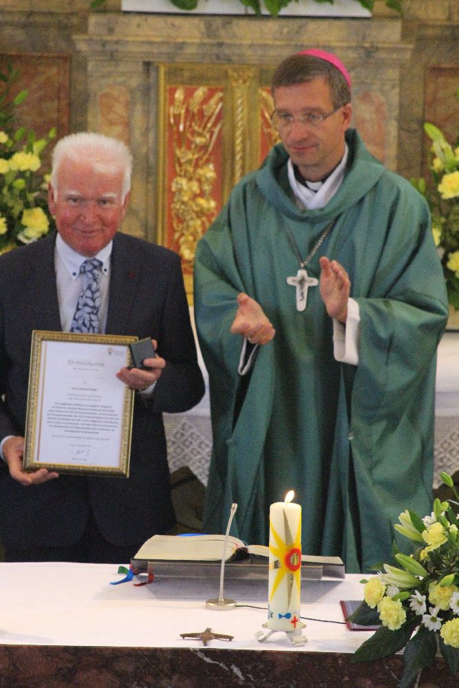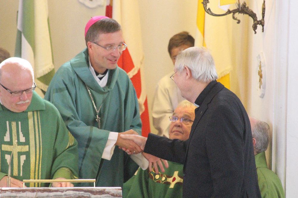 Der Pontifikalamt mit Bischof Dr. Michael Gerber war der Höhepunkt unseres Jubiläumsjahres. Bischof Michael wurde im Pfarrheim von Pfarrer Aul und den Messdienern empfangen. Dort informierte er sich über das 72-Stunden Projekt unserer Jugendlichen. Im Anschluss zog er in einer kleinen Prozession mit musikalischer Begleitung des Musikvereins in die Kirche. Schon unterwegs nutzte er jede Gelegenheit mit Jung und Alt kurz ins Gespräch zu kommen. In der vollen Kirche feierte er mit uns feierlich Eucharistie. In seiner Predigt beeindruckte er u.a. durch seine Kenntnisse über unser Kassel. Unser Pfarrer Karl-Peter Aul hat ihn nach dem Einzug in die Kirche kurz begrüßt und der Sprecher des Pfarrgemeinderates Richard Pfeifer begrüßte ihn zum Abschluss des Gottesdienstes im Namen der ganzen Gemeinde, der kirchlichen Gremien und aller Vereine. Lektor Horst Bender von der evangelischen Emmaus-Kirche sprach ein Grußwort. Den Abschluss in der Kirche bildete die Ehrung von langjährig engagierten Mitgliedern von St. Johannes Nepomuk: Barbara Preus, Mariechen Reitz und Marita Pfeifer als Lektorinnen; Bernhard Sinsel als Küster, Ursula Grob und Karl Schum als Organisten; Richard Pfeifer als Kommunionhelfer.
