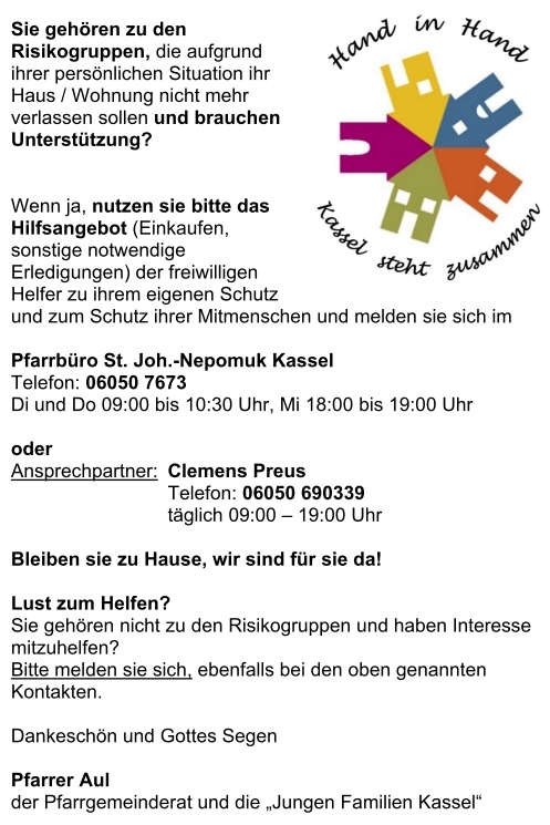 Als Seelsorger der Kath. Kirchengemeinde St. Johannes Nepomuk möchte ich Sie herzlich grüßen in der Hoffnung, dass Sie und ihre Familien gesund sind und es Ihnen gut geht. Aber viele von Ihnen machen sich Sorgen um ihre Gesundheit, um ihre Angehörigen oder auch um ihre wirtschaftliche Existenz.