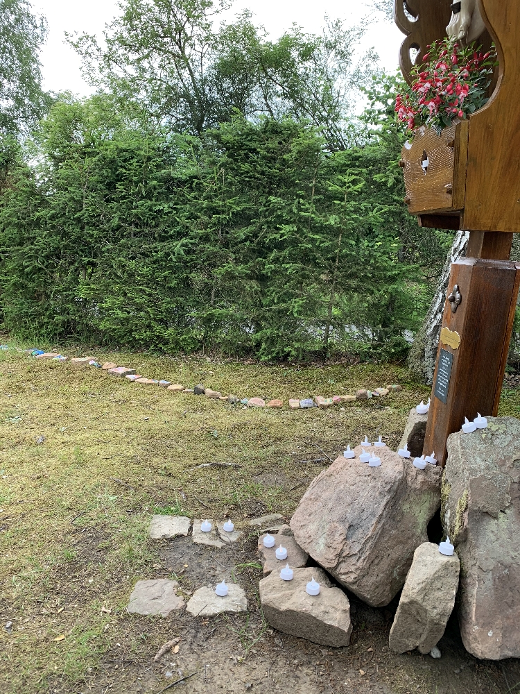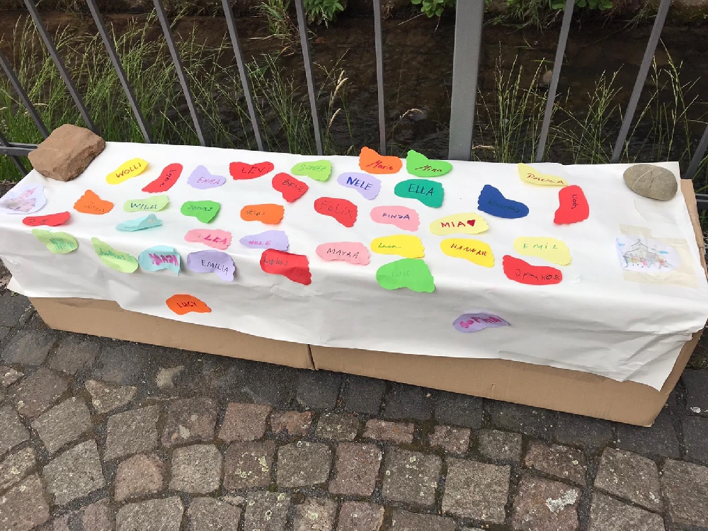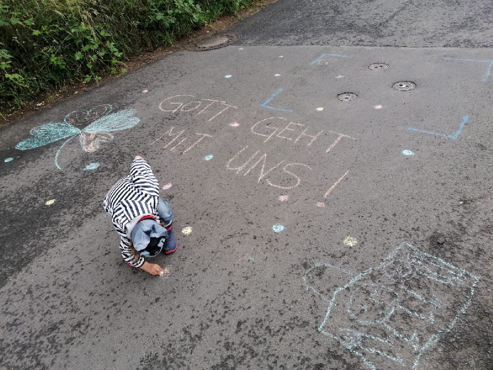 zum Thema beten hören und singen; sie konnten ein Puzzle lösen, Markierungen folgen, den Weg mit Kreide mitgestalten, die uns von Gott geschenkte Natur bewusst wahrnehmen und sie konnten sich als ein Teil Gottes wunderbarer Welt erkennen. Das geographische Ziel der Rallye war das Gottholdseck, wo die Kinder noch einen Stein für die Steinkette gestalten konnten und eine kleine Belohnung auf sie wartete.
