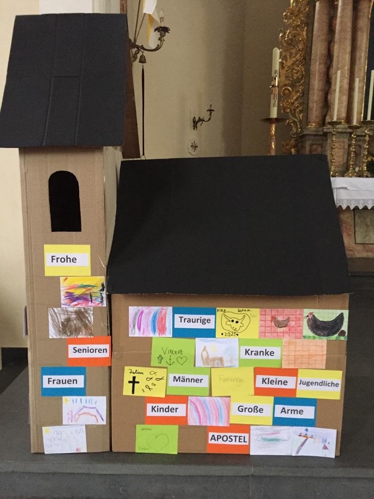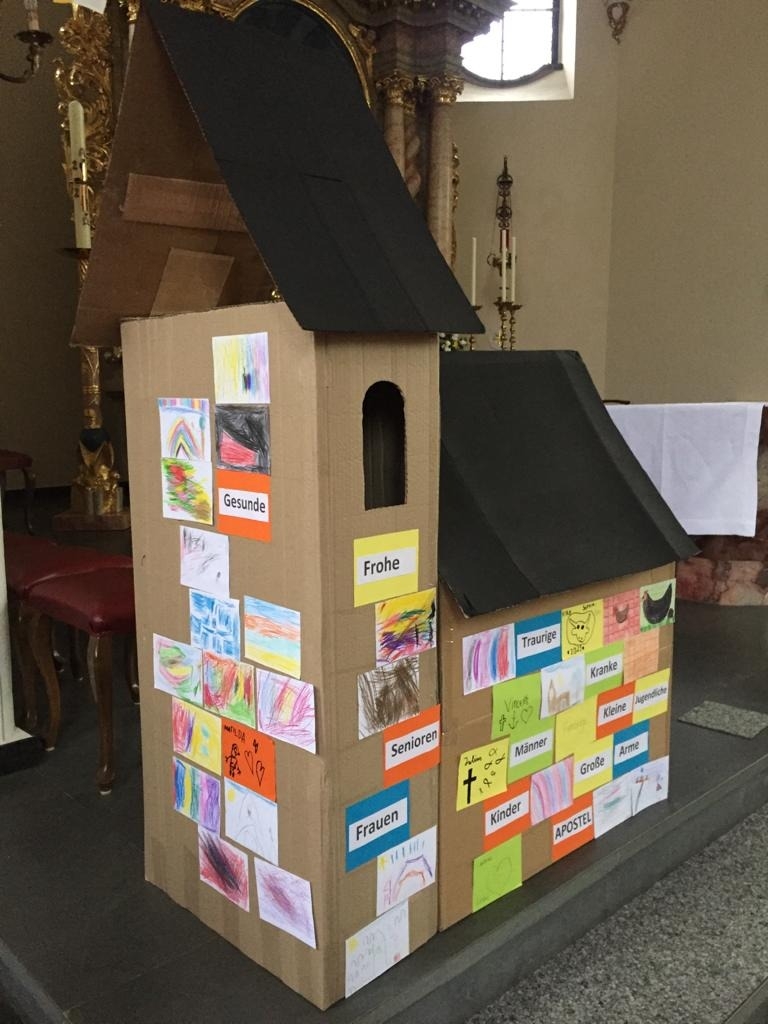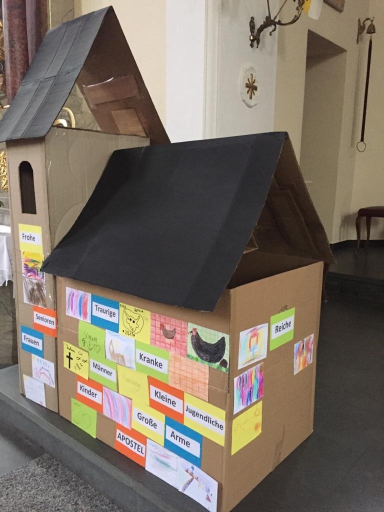 Mitmachaktion zur Kirb - das Ergebnis „Gott baut ein Haus das lebt, aus lauter bunten Steinen“Das Ergebnis der Mitmachaktion ist eine bunte und fröhliche Kartonkirche: Zurück Weiter