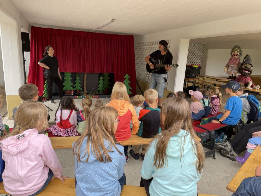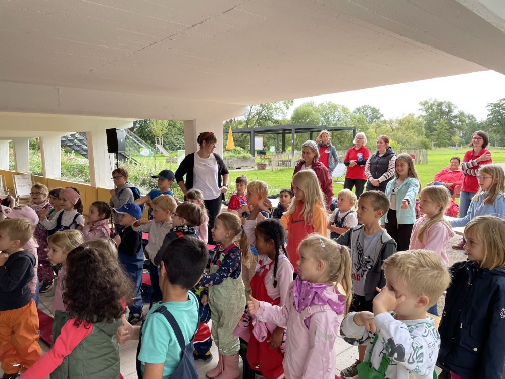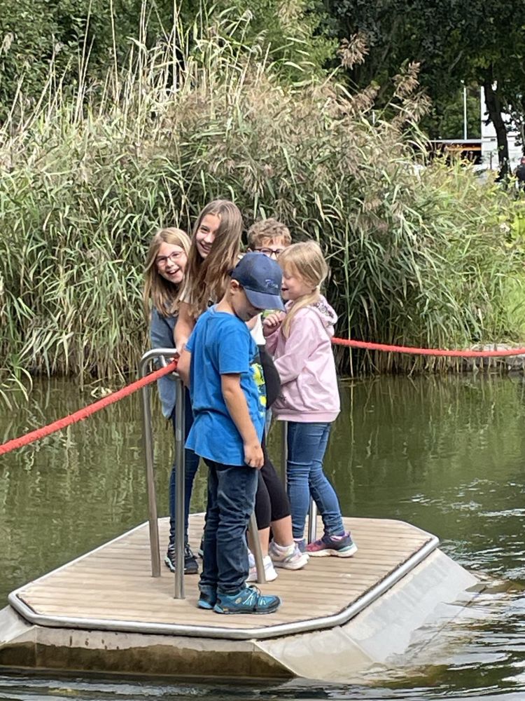 Nach einer spannenden Anreise mit Bus, Bahn und erneutem Bus erreichten wir die Landesgartenschau nach zwei Stunden. Zunächst erkundeten wir den Wassergarten mit Klangoase und Biberlehrpfad, bevor wir schließlich das "grüne Klassenzimmer" erreichten. Hier sahen wir uns die Aufführung "Frau Schuckel, die Umwelt-Fee" des Marionettentheaters Kistenhausen an. Unser Weg führte uns dann zum Floß, bei dem alle Spaß hatten, um von einer Seite des kleinen Sees zur anderen zu gelangen. Nach der Mittagspause setzten wir unseren Ausflug fort, mit Stopps an der Murmelbahn und der Panoramabrücke, bis wir den Tiergarten erreichten. Hier erklärte uns eine Mitarbeiterin viele Dinge, wie zum Beispiel, dass es sich um einen "Wirgarten" handelt, wo Mensch und Tier aufeinandertreffen; dass die Huftiere auf einem Paddock-Trail (Barfusspfad für Tiere) herumlaufen, dass Hühner aus Massentierhaltung aufgenommen wurden und nun glückliche Freilandhühner sind, usw. Zum Abschluss konnten sich alle auf dem großen Spielplatz austoben!