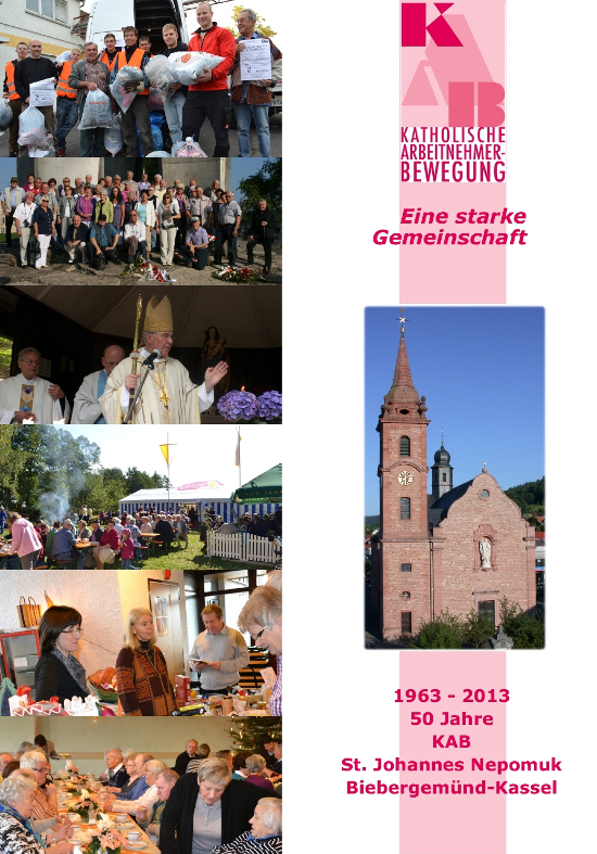 Anfang April mit der Herausgabe einer kostenlosen Festschrift /Chronik »50 Jahre KAB Kassel« für die Mitglieder, Auflage 500 Stück (war auch bei vielen Nichtmitgliedern sehr begehrt). Damit ist es gelungen diese 50 Jahre KAB, 50 Jahre Pfarrgemeinde und Gemeinde Kassel gut zu dokumentieren.