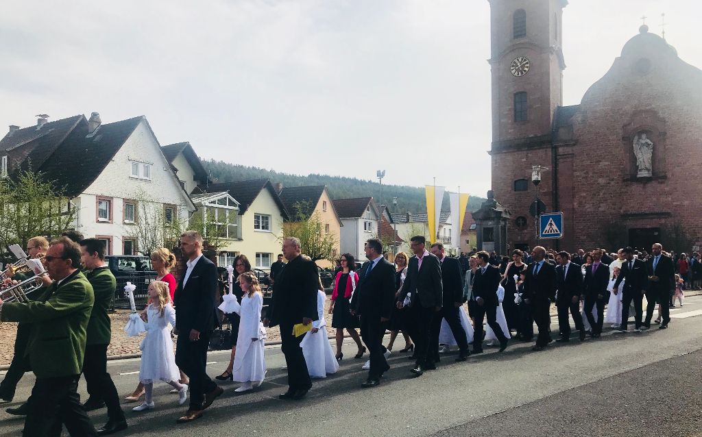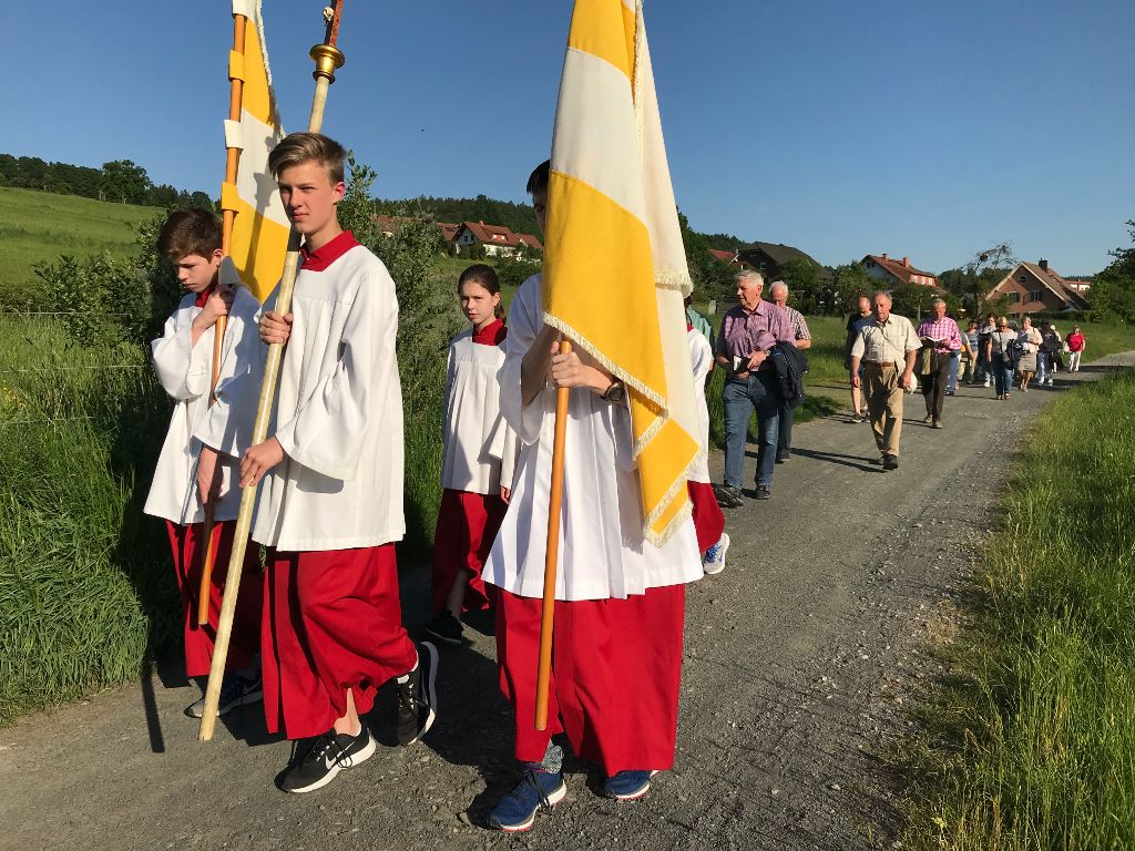 Mit einer stattlichen Flurprozession ging es durch den Ort und durch die Flur zum Bürgerhaus. Unterwegs und an drei Altären wurde um den Segen Gottes für die Früchte der Felder erbeten, gleichzeitig aber auch Dank dafür gesagt.